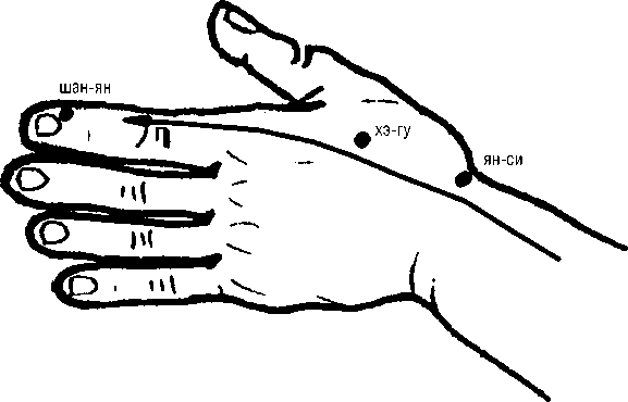 Техника воздействия по меридианному типу действенна при таком состоянии больного, когда ему необходимо добиться успокаивающего эффекта. Применяемые манипуляции выполняются целенаправленно, при этом всегда против направления хода данного меридиана (рис. 16).
