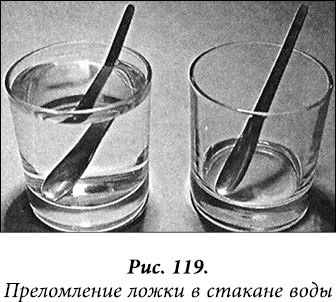 Поэтому мы получаем энергию из двух миров. Живя в Солнечной системе, мы как бы находимся внутри «плаценты» тела Создателя. И потому исповедуем определенные нравственные принципы, данные именно нам, землянам. За пределами Солнечной системы эти неписаные правила могут быть совсем другими. На границе двух сред (в данном случае – границы Солнечной системы) происходит преломление понятий, как у ложки в стакане (рис. 119). Поэтому с энергией, приходящей из внешнего «перпендикулярного» мира, приходит и масса возможностей, не связанных с нравственными понятиями. Поэтому люди, не имеющие стержня, получая эту энергию, могут терять ощущение барьеров, рамок дозволенного, стирание граней между Добром и Злом.