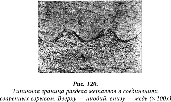 И этим она обязана своим синусоидальным движением. Как, к примеру, и граница раздела разнородных металлов и сплавов: при сварке таких металлов взрывом она обычно резко выражена и имеет вид регулярных синусоидальных волн (рис. 120). Идет борьба двух сред, их вытеснение друг другом. Когда один вытесняет другого, происходит преломление, и опустившаяся линия синусоиды идет на подъем.