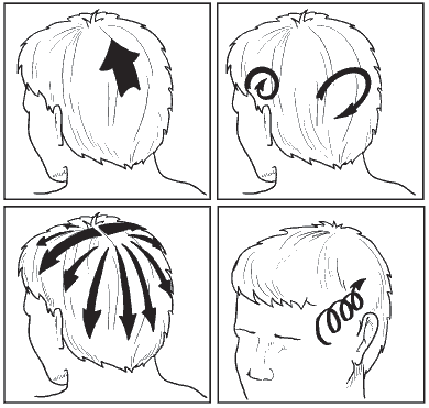 3. Сделать на голове пробор по направлению роста волос. На него поместить кончики пальцев (кроме большого) одной руки. Другая рука должна лежать рядом. Сделать 8–10 легких поглаживаний ото лба к затылку. Таким же образом сделать еще 6–8 проборов и промассировать их все: сначала ото лба к затылку и от висков к макушке, а затем от макушки к задней области шеи.