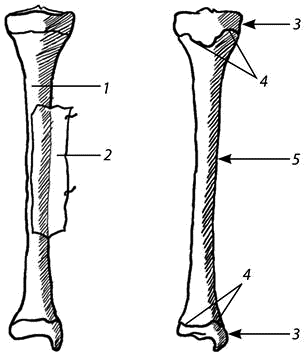 1 – наружный слой надкостницы; 2 – внутренний слой надкостницы; 3 – эпифизы (концы); 4 – метафизы (зоны роста кости); 5 – диафиз