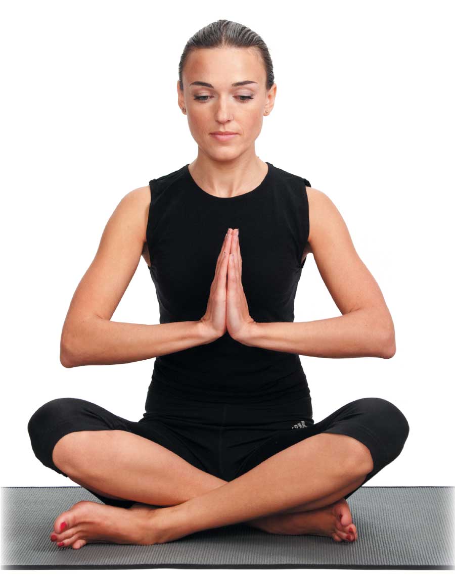 Следите за тем, чтобы обе ноги были перекрещены в лодыжках, а позвоночник вытянут вертикально. Руки при этом сложены в намасте перед грудью.