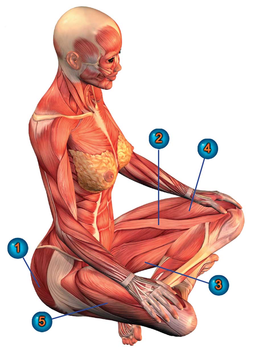 В идеале должно быть достигнуто максимальное расслабление мышц туловища и конечностей. Активно задействуются только мышцы, выпрямляющие позвоночник. Однако в сукхасане чем выше располагаются коленные суставы по отношению к тазобедренным, тем больше сгибаются бедра. Это приводит к дополнительному напряжению мышц спины и таза, пытающихся удержать физиологические изгибы позвоночника. В этом случае они быстрее устанут. Поэтому под таз можно подложить подушку или свернутое одеяло. Чем меньше подвижны суставы и ниже растяжимость мышц, тем выше должна быть опора.