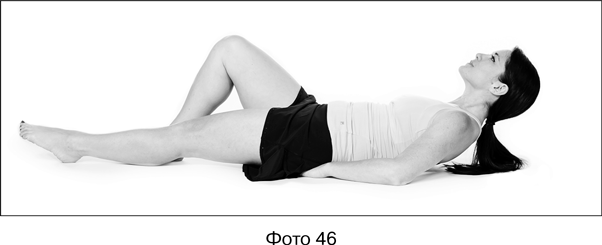 2. Напрягите пресс, подбородок должен смотреть вперед. На выдохе приподнимите от пола голову и плечи, не прогибаясь в спине (см. фото 46). Грудь нужно тянуть к потолку, а не к коленям.