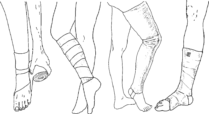 Что касается бинтования стопы, то здесь возможны некоторые отступления от правил бинтования в зависимости от вида обуви, которая сама по себе может обеспечивать компрессию стопы. Поэтому допустимо менее тщательное бинтование стопы.
