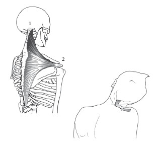 При сокращении верхней порции трапециевидной мышцы плечо поднимается вверх, а шейные позвонки осуществляют комбинацию движений наклона и поворота, сближая основание затылочной кости (начало – 1) с акромионом (место прикрепления – 2).