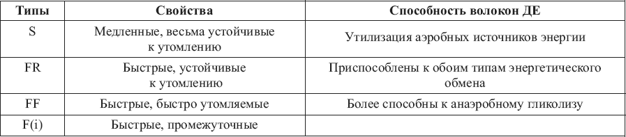 Есть мнение [А. А. Гидиков, 1975; Д. Козаров, Ю. Т. Шапков, 1983], что у человека наиболее надежно различаются лишь ДЕ, относящиеся к двум крайним типам – медленные, устойчивые к утомлению (S) и быстрые, быстро утомляемые (FF).