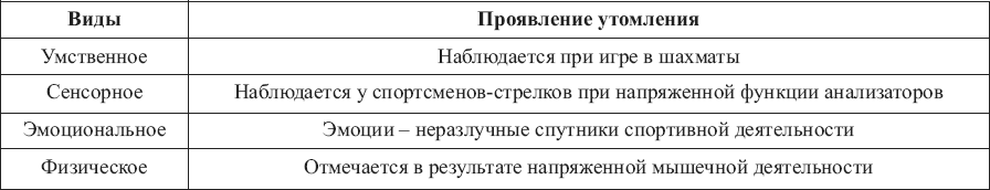 В спортивной практике приобретают особое значение диагностика и изучение показателей, которые сопровождают и сигнализируют об утомлении. Отличают несколько наиболее общих направлений: увеличение числа ошибок «как результат расстройства координации движений»; неспособность к созданию и усвоению новых полезных навыков; расстройство старых ранее приобретенных навыков; увеличение энергетических, прежде всего углеводных, трат на единицу произведенной работы и т. д. [Л. Б. Лектман, 1952; В. С. Фарфель, Я. М. Коц, 1968; Ф. М. Талышев, 1972]. Принято различать четыре основные вида утомления (табл. 5).