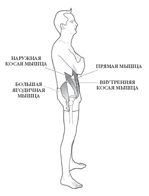 Ретроверсия таза может осуществляться за счет сокращения больших ягодичных мышц, брюшных мышц или и тех и других мышц одновременно. Мышцы подколенного сухожилия (не показаны на рисунке) действуют в качестве вспомогательных мышц при осуществлении данного движения.