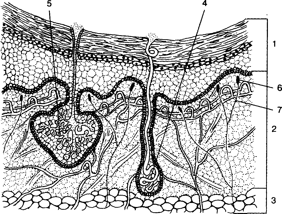 Кожа млекопитающих: 1 – эпидермис; 2 – дерма; 3 – жировая клетчатка; 4 – потовая железа; 5 – сальная железа; 6 – рецепторы;7 – нервы