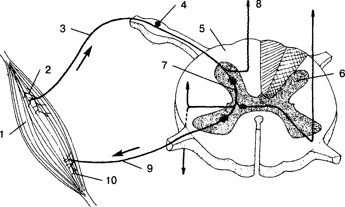 Работа проприорецепторов: 1 – мышца; 2 – проприорецепторы в мышечной ткани; 3 – чувствительный нейрон (нервная клетка); 4 – тело нервной клетки; 5 – белое вещество спинного мозга; 6 – серое вещество спинного мозга; 7 – промежуточный нейрон; 8 – импульсы, посылаемые в головной мозг; 9 – двигательный нейрон; 10 – нервные окончания, передающие сигнал мышечным волокнам.