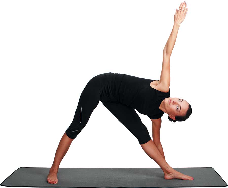 С выдохом наклоните корпус вправо, взявшись правой рукой за лодыжку. Левую руку расположите на одной линии с плечами и правой рукой. Затем поверните голову и удерживайте взгляд на большом пальце левой руки. Живот и грудную клетку разверните строго вперед, плечи отведите вниз от головы. В конечной стадии удерживайте асану со спокойным дыханием.