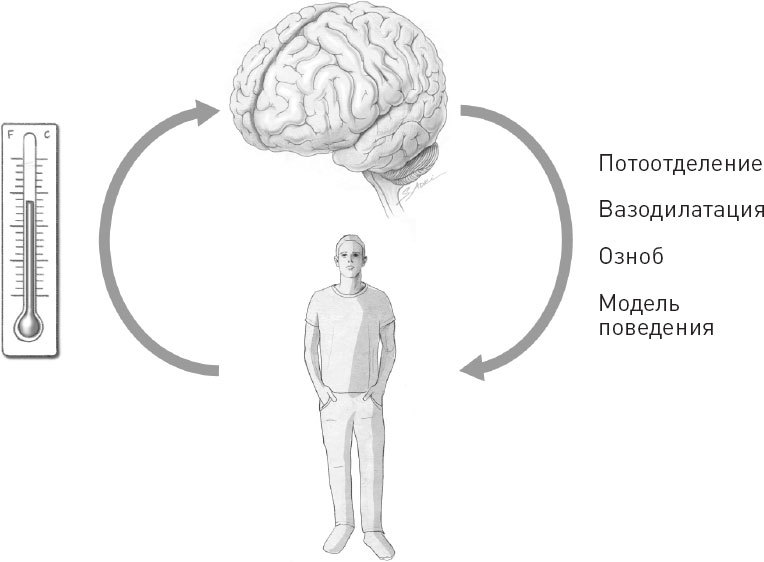 Рис. 32. Гомеостаз температуры тела. Мозг (сверху) измеряет температуру тела при помощи внутренних и внешних термометров (слева) и регулирует температуру в соответствии с этими данными при помощи различных психологических и поведенческих шаблонов (справа).