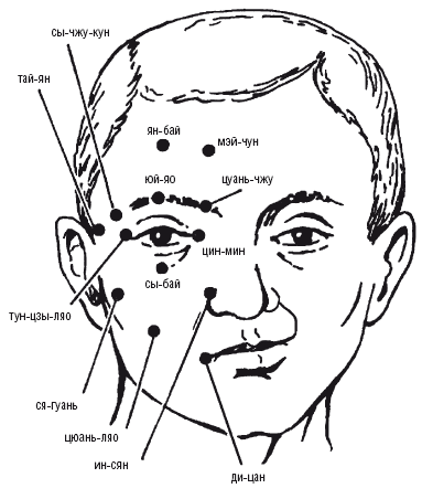 7. На 0,3 см кнутри от внутреннего угла глаза (цин-мин).