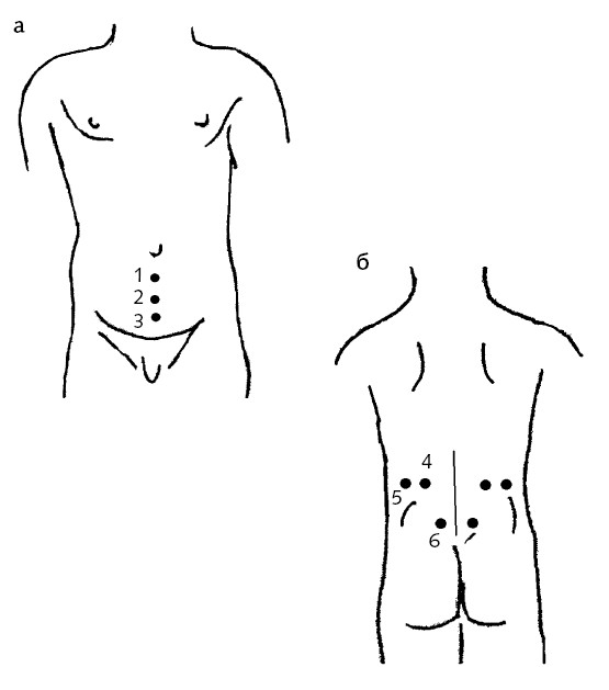 Точки 6, парные (рис. 43, б). Расположены на спине в крестцовой области, слева и справа от срединной линии на ширину в два сложенных пальчика. Массируются, как точка 4.
