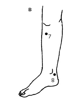 Точки 7, парные (рис. 43, в). Расположены на передней поверхности ноги (несколько кнаружи от вертикальной оси ноги) на ширину ладони ниже коленной чашечки. Ребенок лежит на спине или сидит, вытянув ноги. Точки массируются одновременно на обеих ногах.