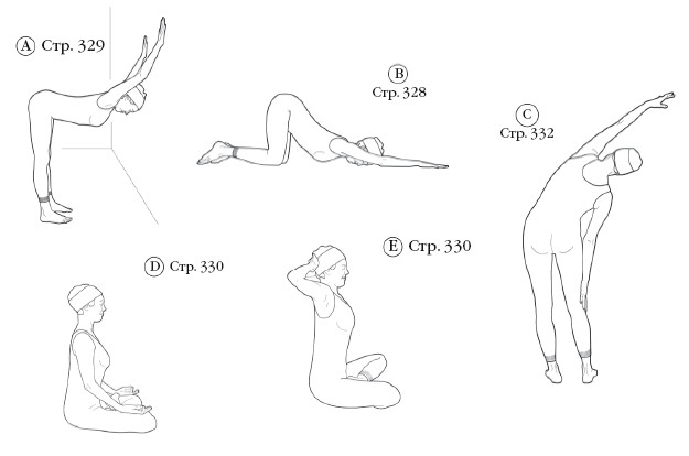 • Растяжение широчайшей мышцы спины (С). В профиль видна траектория данной мышцы. Можно заметить, как она проходит вдоль грудного и поясничного отдела позвоночника. У людей, имеющих усиленный изгиб позвоночника в данных отделах, эта мышца укорочена из-за сближения точки начала и места прикрепления. В данных случаях очень важно делать растяжку широчайшей мышцы спины.