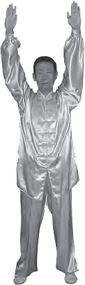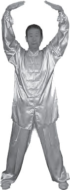 1. Переместить вес тела влево. Сделать шаг правой ногой в сторону. Стать прямо, ноги врозь. Поднять руки на уровень груди, развернуть ладони вовнутрь, потом поднять руки вверх. Когда руки подняты над головой, локти слегка согнуты, ладони направлены вверх, пальцы – друг на друга, взгляд – прямо (рис. 5–1).
