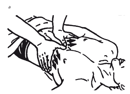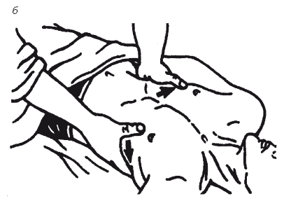 Рис. 59. Воздействие на область грудной клетки по краю реберных дуг: а – начало движения; б – конец движения