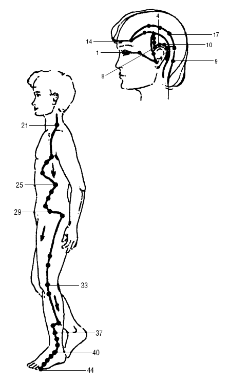1 – тун-цзы-ляо; 2 – тин-хуэй; 3 – шан-гуань (кэ-чжу-жэнь); 4 – хань-янь; 5 – сюань-лу; 6 – сюань-ли; 7 – цюй-бинь; 8 – шуай-гу (шу-ай-цзяо); 9 – тянь-чун; 10 – фу-бай; 11 – тоу-цяо-инь; 12 – тоу-вань-гу; 13 – бэнь-шэнь; 14 – ян-бай; 15 – тоу-лин-ци; 16 – му-чуан; 17 – чжэн-ин; 18 – чэ-лин; 19 – нао-кун; 20 – фэн-чи; 21 – цзянь-цзин; 22 – юань-е; 23 – чжэ-цзинь; 24 – жи-юе; 25 – цзин-мэнь; 26 – дай-май; 27 – у-шу; 28 – вэй-дао; 29 – цзюй-ляо; 30 – хуань-тяо; 31 – фэн-ши; 32 – чжун-ду; 33 – цзу-ян-гуань; 34 – ян-лин-цюань; 35 – ян-цзяо; 36 – вай-цю; 37 – гуан-мин; 38 – ян-фу; 39 – сюань-чжун; 40 – цю-сюй; 41 – цзу-линь-ци; 42 – ди-у-хуэй; 43 – ся-си; 44 – цзу-цяо-инь
