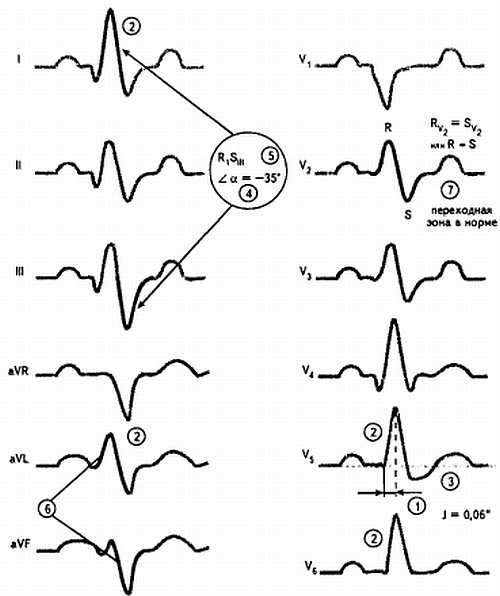 (1) Увеличение времени внутреннего отклонения J = 0,06"; (2) Увеличение амплитуды зубца R; (3) Субэндокардиальная гипоксия; (4) Lα = —35° — блокада передней ветви левой ножки пучка Гиса; (5) RISIII — левограмма; (6) Полугоризонтальная электрическая позиция сердца; (7) Смещение переходной зоны в отведение V2