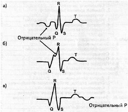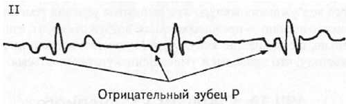 Отрицательный зубец Р может располагаться перед желудочковым комплексом QRS, на нем и после него. Это зависит от условий ретроградного проведения импульса пейсмекерных клеток атриовентрикулярного соединения к предсердиям. Если проведение импульса ускорено, то отрицательный зубец Р будет располагаться перед нормальным желудочковым комплексом QRS. При обычном проведении импульса отрицательный зубец Р запишется на комплексе QRS, который при этом будет слегка деформирован этим зубцом. В случае замедленного проведения атриовентрикулярного импульса отрицательный зубец Р расположатся после комплекса QRS.