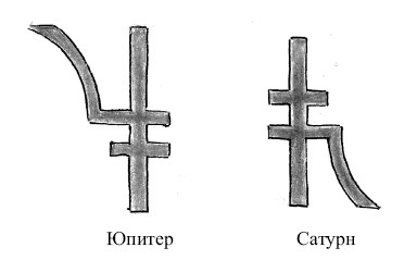 Если вглядеться в символические изображения этих планет, можно увидеть следующее: символ Сатурна – серп. Сатурн предстает в роли хмурого жнеца (с серпом, с косой). Ну да, образ неумолимого времени, которому нет никакого дела ни до наших эмоций, ни до наших побед или усталости. Косарь движется медленно и хмуро, «сжиная» все на своем пути и всему придавая форму, которая возникает, чтобы потом быть бесстрастно уничтоженной. Знакомый по картинам средневековых художников, например А. Дюрера, образ Смерти. Человек так восприимчив к символам и образам! А символ Юпитера очень похож на символ Сатурна, только перевернутый.