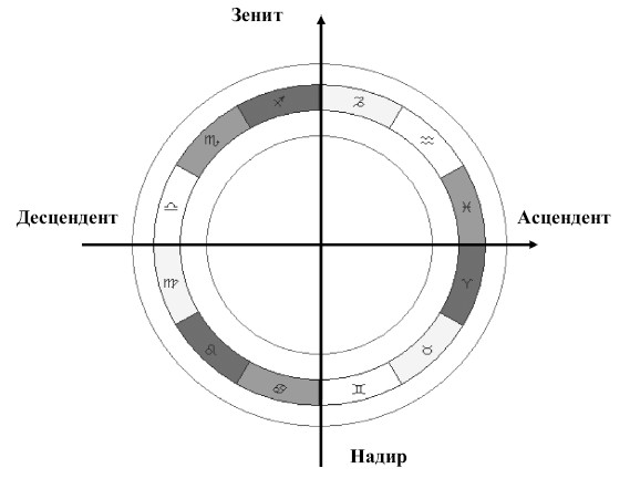Четыре точки – самые важные: Асцендент, Десцендент, Надир и Зенит. Графически это похоже на крест (картинка).