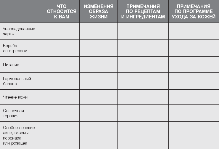 Итак, давайте соберем все, что мы узнали из книги об уходе за кожей, и знания о вашей собственной коже и начнем составлять план по достижению идела. Во-первых, соберите всю информацию в одном месте. Вы уже можете заполнить два первых столбца и сделать ссылки на рецепты из предыдущей главы в третьем. По мере прочтения третьей главы вы сможете постепенно заполнить и последний столбец.