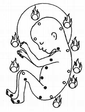 Рис. 1–1. В организм человеческого зародыша жизненная сила Ци и физиологические жидкости поступают по пуповине и распределяются по малому небесному кругу, или Микрокосмической Орбите.