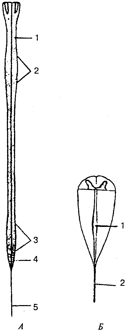 А: 1 — спинной мозг: 2 — шейное утолщение; 3 — пояснично-крестцовое утолщение; 4 — мозговой конус; 5 — концевая нить; Б: 1 — концевой желудочек; 2 — концевая нить