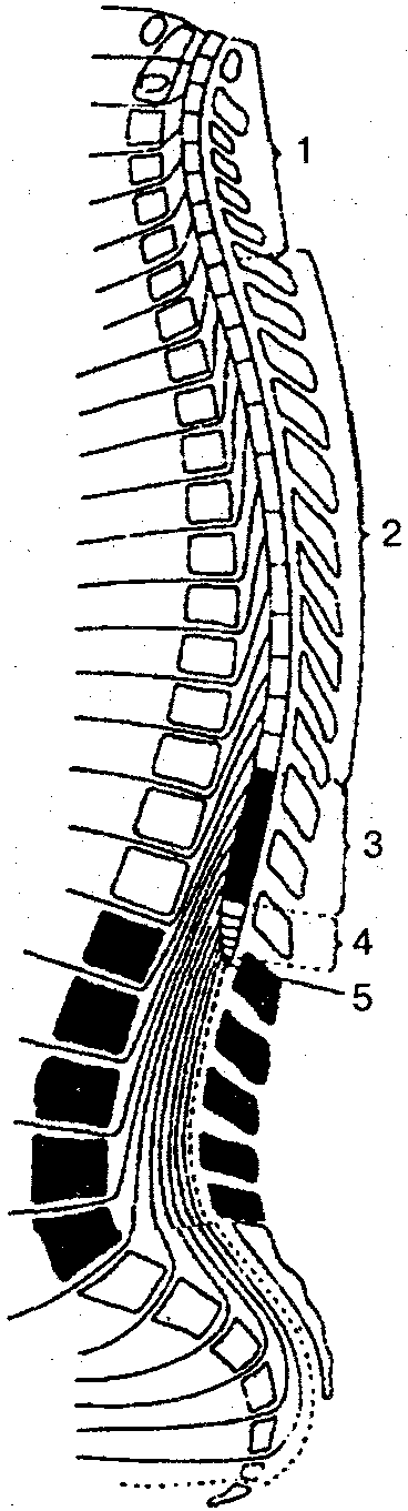 1 — шейные сегменты (1—8), шейная часть; 2 — грудные сегменты (1—12), грудная часть; 3— поясничные сегменты (1—5), поясничная часть; 4— крестцовые сегменты (1—5), крестцовая часть; 5— копчиковые сегменты (1—3), копчиковая часть