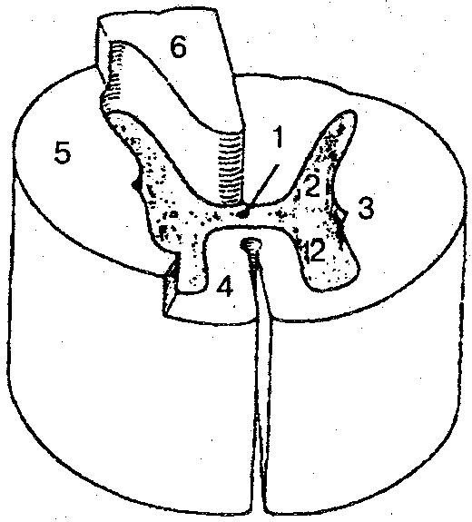 1 — центральный канал; 2 — серое вещество; 3 — белое вещество; 4 — передний канатик; 5 — боковой канатик; 6 — задний канатик