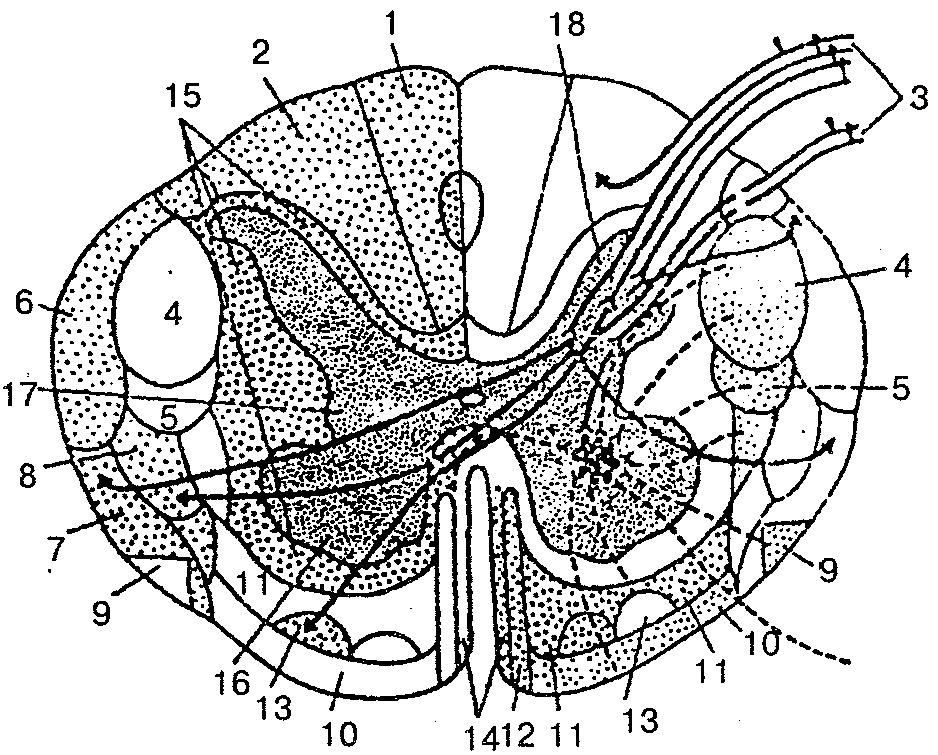 1 — тонкий пучок; 2 — клиновидный пучок; 3 — задний корешок; 4 — латеральный корково-спинномозговой (пирамидный) путь; 5 — красноядерно-спинномозговой путь; 6— задний спинно-мозжечковый путь; 7— передний спинно-мозжечковый путь; 8—латеральный спинно-таламический путь; 9 — оливоспинномозговой путь; 10 — преддверно-спинномозговой путь; 11 — ретикулярно-спиниомозговой путь; 12 — передний корково-спинномозговой (пирамидный) путь; 13 — передний спинно-таламический путь; 14 — покрышечно-спинномозговой путь; 15 — задний боковой и передний собственные пучки; 16— передний рог; 17—боковой рог; 18— задний рог