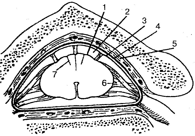 1 — мягкая оболочка спинного мозга; 2 — подпаутинное пространство; 3 — паутинная оболочка спинного мозга; 4 — твердая оболочка спинного мозга; 5 — эпидуральное пространство; 6 — зубчатая связка; 7 — промежуточная шейная перегородка