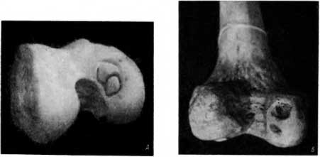 Рис. 50. А — частичный остеолиз, или рассекающий остеохондрит; фаза, предшествующая отторжению; Б — частичный остеохондролиз, или рассекающий остеохондрит, после отторжения двух фрагментов.