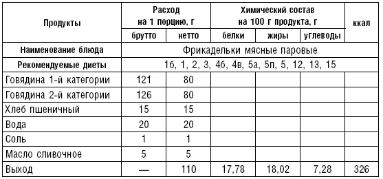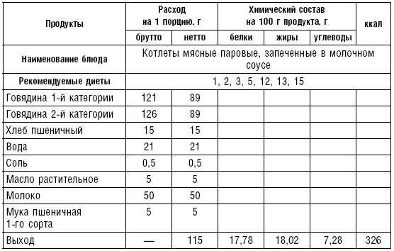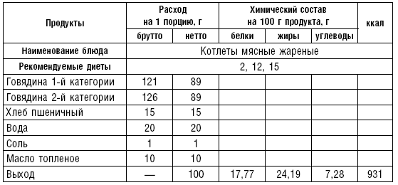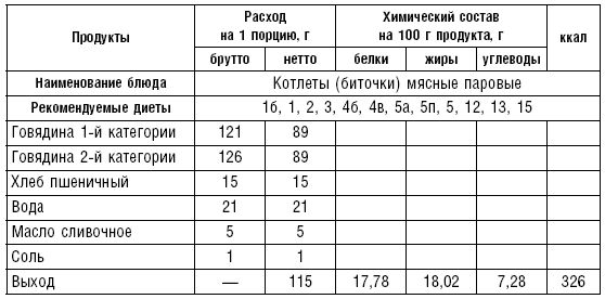 Из вырезки делают бифштекс, лангет, филе, из толстого и тонкого края — антрекот. Мелкорубленые полуфабрикаты нарезают кусочками по 5–8 г (бефстроганов), 10–15 г (азу), 20–40 г (гуляш, рагу). Из рубленого мяса готовят натуральные полуфабрикаты (без хлеба) и котлетную массу (с хлебом). Котлетную массу делают из мяса, освобожденного от сухожилий и фасций и пропущенного 2 раза через мясорубку, с добавлением размоченного черствого белого хлеба из расчета 15 г хлеба на 100 г мяса. Вместо хлеба можно вводить вязкую рисовую или манную кашу, свежий некислый творог. В котлетную массу добавляют по показаниям лук, соль, размешивают и пропускают через мясорубку, затем добавляют 30 % молока или воды. Фарш взбивают и готовят различные изделия: котлеты — овальной формы с заостренными концами, биточки — круглой формы, шницель — овальной формы, тефтели — шаровидной формы, зразы, фрикадельки, рулеты и др.