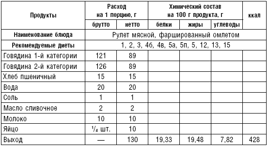 Рулет мясной паровой. Котлетную массу раскладывают слоем в 1,5 см на марлю, смоченную водой. В середину помещают сваренное вкрутую и мелко нарезанное яйцо. Затем, приподнимая марлю с одной стороны, соединяют края котлетной массы, вместе с марлей кладут на решетку паровой кастрюли и варят.
