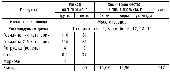 В диетах № 2, 15 необходимо сохранять азотистые экстрактивные вещества. Для достижения этого мясо кусками по 1,5–2,5 кг погружают в кипящую воду, кладут лук, коренья и варят до готовности. В конце варки добавляют соль. Мясо готово, если при прокалывании вилкой оно выделяет прозрачный сок. Готовое мясо режут на порции, заливают водой или бульоном и снова варят 15–20 мин.