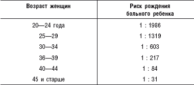 Таблица 5. Риск рождения больного ребенка в зависимости от возраста матери (Здоровье. 1991. № 2)