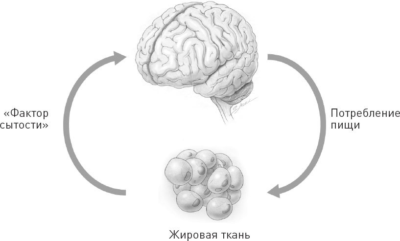 Рис. 31. Липостатическая система Ромэйна Херви. Жировая ткань (внизу) вырабатывает фактор сытости, который воздействует на мозг (вверху), который, в свою очередь, контролирует аппетит и сдерживает адипозность.