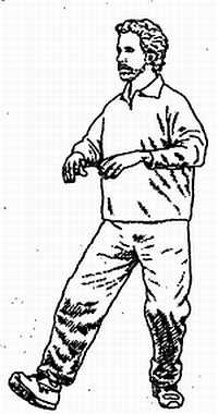 Далее начните плавно раскачиваться вперед и назад. Делайте это, попеременно поднимая левую пятку, что сдвинет вас слегка вперед, и носок правой ноги, что сдвинет вас слегка назад. Раскачиваясь вперед и назад, держите спину прямой. Не увлекайтесь этим процессом. Колени должны оставаться согнутыми, и центр тяжести смещен вниз. Когда поднимаете пятку, нога всей ступней должна стоять на земле. Аналогично, когда отрываете носок, стоящая сзади нога должна полностью оставаться на земле. Все это обеспечивает устойчивую, но подвижную и изменчивую стойку.
