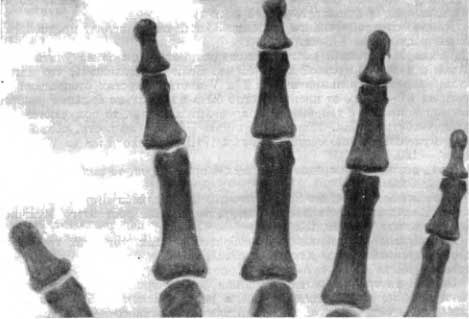 Рис. 111. Рентгенограмма дистального отдела кисти мужчины эпохи мезолита, нет даже начальных проявлений старения.