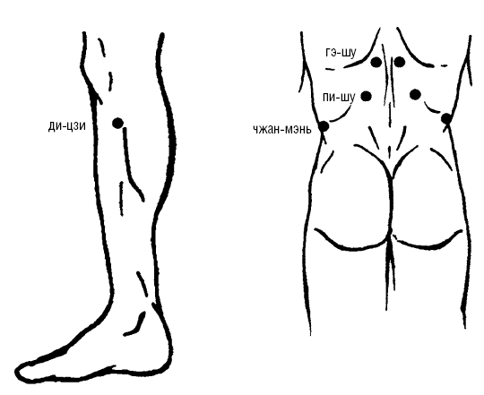 Бывает при нарушении диеты, неполноценном питании, переедании, наличии желчно-каменной болезни. Острая боль в верхней половине живота, с локализацией слева. Боли отдают в спину, имеют опоясывающий характер, сопровождаются тошнотой, рвотой, вздутием живота, отсутствием аппетита. Проводить точечный массаж следует по тормозной, седативной, успокаивающей технике, в позе массируемого лежа на правом боку (рис. 59).