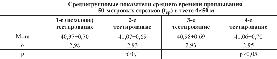 В эксперименте выявлено отсутствие достоверных изменений (р>0,1) среднегрупповых показателей среднего времени проплывания 50-метровых отрезков юными пловцами в тестированиях «2», «3», «4» по сравнению с исходным («1») тестированием, на протяжении 6-недельных тренировочных микроциклов. Выявлено отсутствие значимых различий (р>0,1) среднегрупповых показателей скорости проплывания юными пловцами отдельных 50-метровых отрезков в тесте 4?50 м в тестированиях «1», «2», «3», «4» на протяжении 6-недельных тренировочных микроциклов.