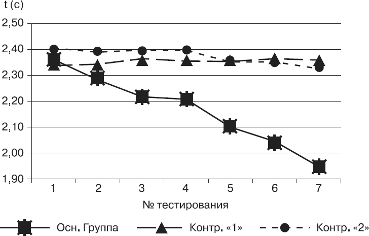 Выраженный прирост специфических скоростных качеств у хоккеистов основной группы (рис. 2) вполне объясним эффектом тренировочного режима и тренировочных нагрузок, использованных нами в специальной скоростной подготовке спортсменов данной группы на протяжении 6 недель.