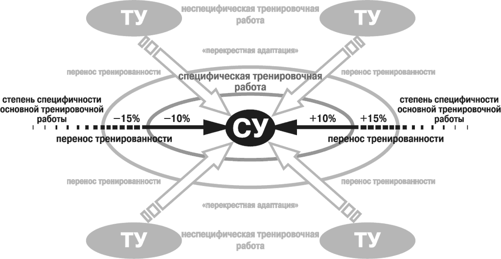 Рис. 3. Принципы переноса тренированности (СУ – соревновательное упражнение; ТУ – дополнительные тренировочные упражнения)