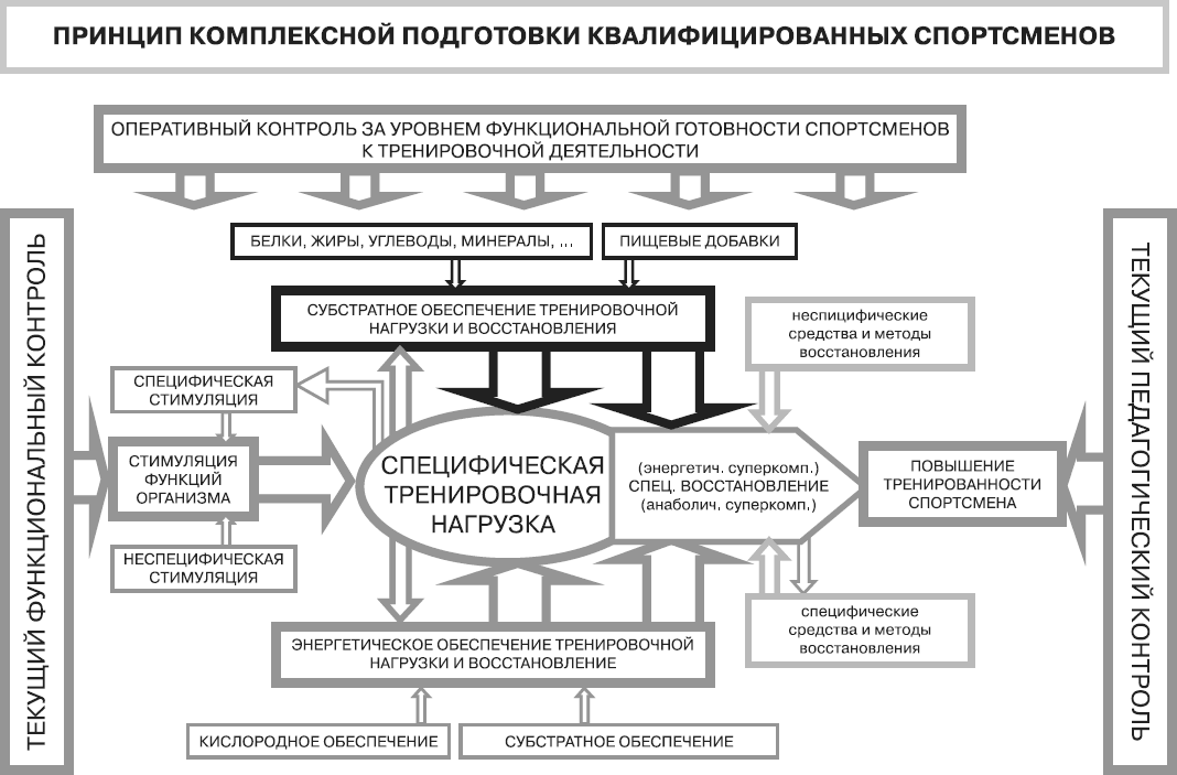 Главенство спортивно-педагогического процесса не исключает единства различных сторон подготовки квалифицированного атлета и обуславливает их взаимозависимость и взаимовлияние на содержание каждой из ее составляющих. Выше уже сказано, что каждый компонент системы должен выбираться и использоваться исходя из принципа его взаимосодействия для повышения специальной тренированности атлета и достижения максимально возможного для каждого отдельного индивидуума на данный момент спортивного результата. Но введение в систему таких компонентов неизбежно приводит к необходимости внесения соответствующих корректив в тренировочный процесс. В частности, чем больше прогнозируемая эффективность мероприятий по восстановлению и повышению спортивной работоспособности, тем более специфичной должна быть направленность тренировочного процесса. В противном случае неизбежна стимуляция в организме спортсмена адаптационных изменений, которые могут оказаться не просто ненужными, но и «вредными» для конкретного вида спорта. Из сказанного следует, что спортивная тренировка на всех этапах подготовки атлета вообще должна быть специфичной [А. Н. Блеер с соавт., 2013].