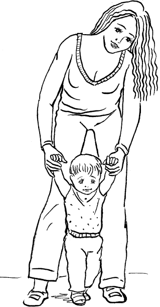 Поставьте ребенка на пол спиной к себе и, держа обе его ручки за кисти, не спеша делайте шаги вместе с ним. И не тяните ребенка за руки вперед. Дайте ему возможность спокойно, не торопясь передвигать своими ножками. Для начала достаточно и 10 шагов.