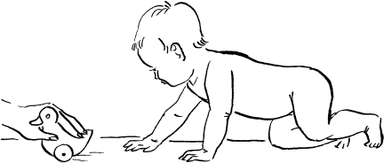 Поставьте малыша на четвереньки и положите перед ним игрушку. Пусть он двигается вперед к игрушке, а вы для этого переставляйте ее все время чуть дальше. Повторите 4–6 раз.